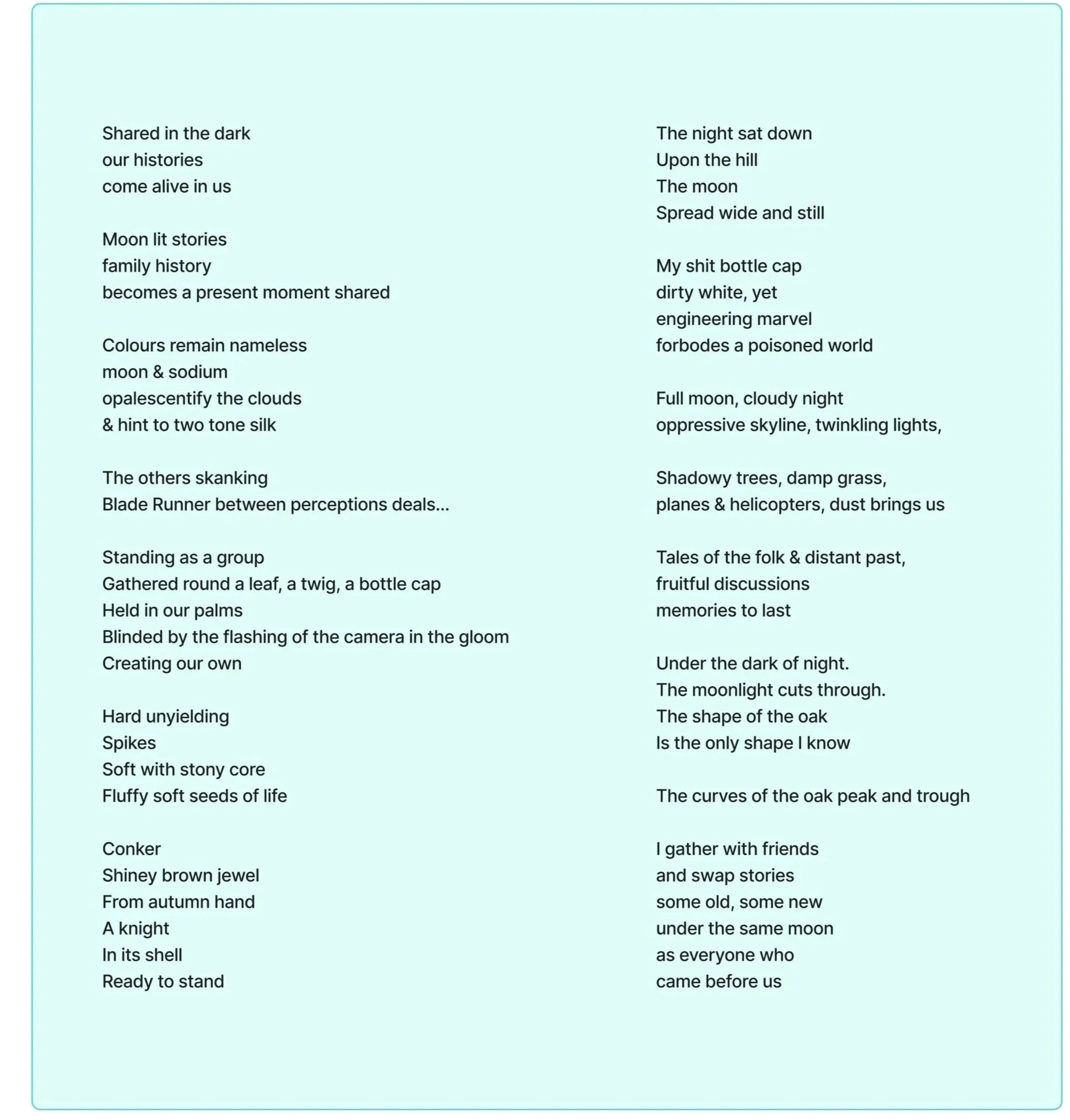 In conclusion, only in retrospect have I come to understand that this project lies at the intersection of user experience design, relational aesthetics, and landscape art, a space that many people have not much experience with and therefore has been difficult to clearly define. Creating this set of experiences has taught me that providing a space for both cultural reflection and emotional processing can be life-affirming and profoundly meaningful. Storytelling can introduce intense emotional perspectives in a nuanced and non-confrontational manner, leading to group discussions that can navigate more complex issues than directly taking a stance on an issue. Collective creation can help bond and synchronise a community, both physically and psychologically, and improve the confidence of the individual. However, facilitating a co-created exploratory experience can be challenging, as you don’t always know what you will get and can end up traversing many paths of research that you may not have time to fully unpack. The process can be as dependent on the energy, motivation and problem-solving ability of your participants as it is on your own planning and intuitive responses to the collective atmosphere. Careful documentation of these kinds of experiences is important, but it is very challenging to do so without being intrusive to the participants' experience. However, having extra pairs of hands is essential.