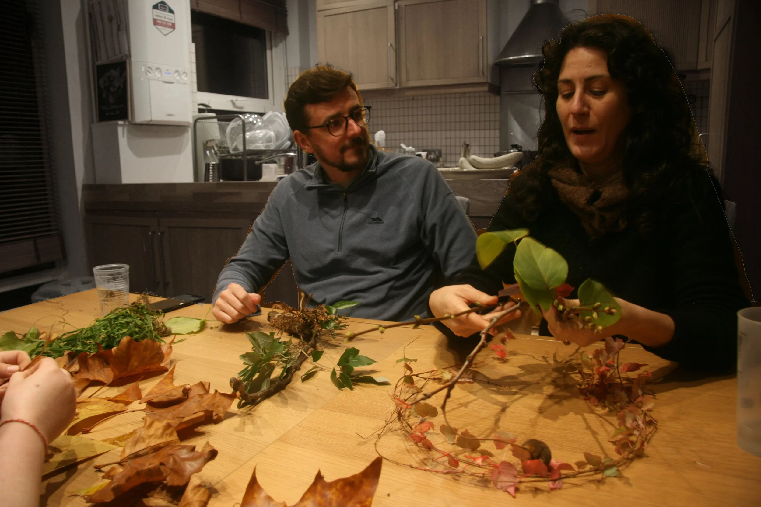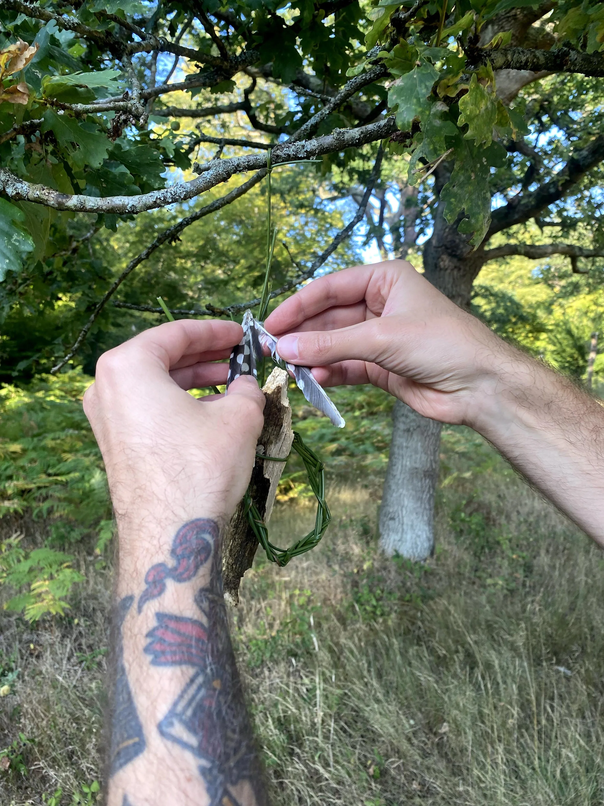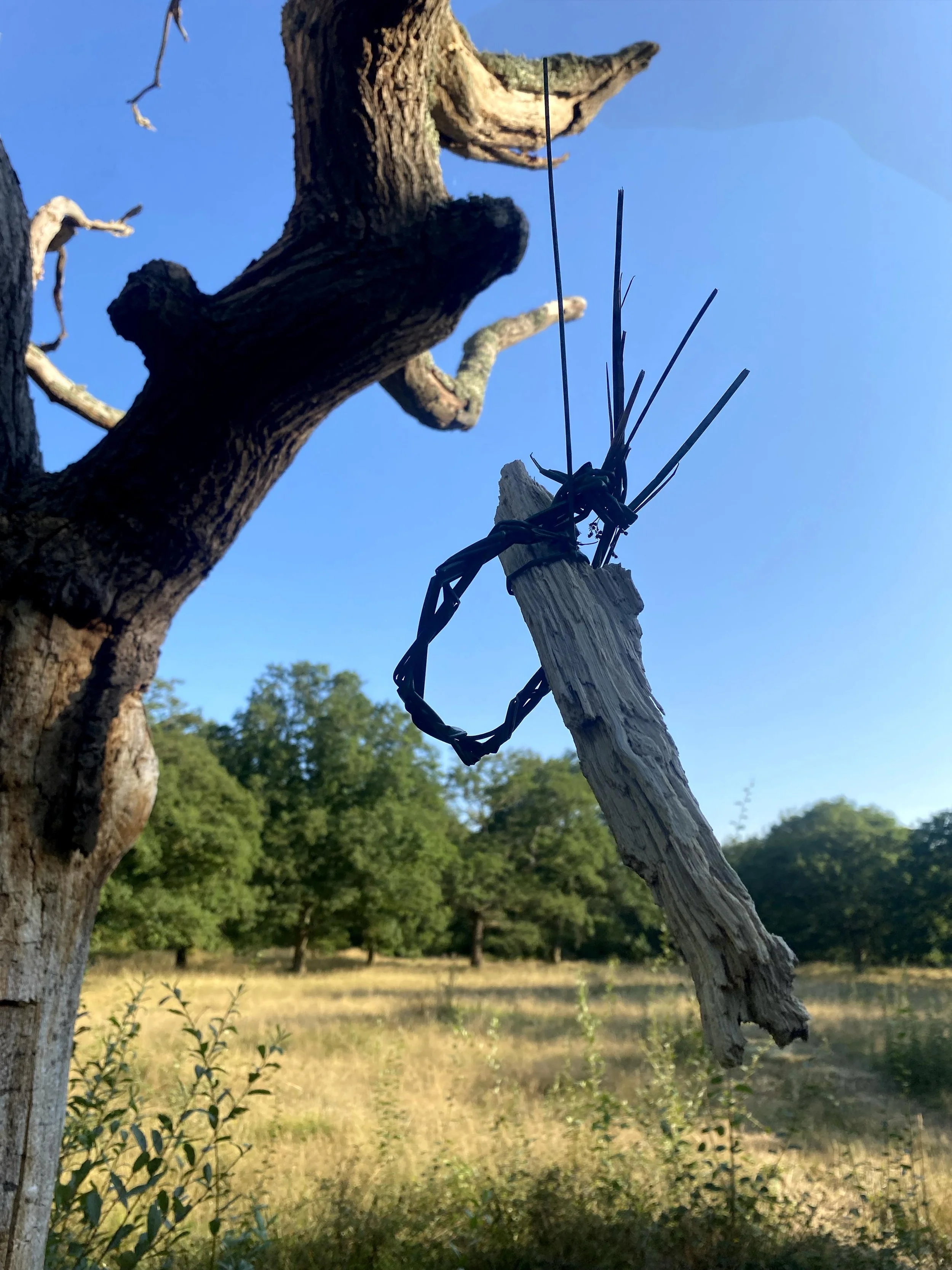 After analysing the workshop findings, I developed my ideas on incorporating the future timeline into my process. I did this by researching CBT techniques. Booth, R. W., Erhan, K., Erkocaoğlan, O., Kuşpınar, H., & Yaldırak, K. (2025) found that ‘BPS’ writing can have direct effects on mood, so I worked out my new iteration with the object task involving taking a present problem, i.e., an emotional need for creativity, self-belief, etc., and asking participants to gather materials from the environment that symbolically represent these things to create a talisman for the future. I ran a workshop with three participants and used a handheld camera to document the process more thoroughly. During the onboarding meal conversation explored the themes of ritual and projecting into the future. One of the participants arrived late, so he was not onboarded properly, which disrupted his perception of folklore within the project context. One participant had attended the previous workshop, introducing a certain amount of bias, which I attempted to counteract by using participant-chosen locations and formatting the object task. The walk activated our sensory connection to the environment and embodied the folkloric quest; participants offered local histories without my prompting, and conversation naturally turned to symbolic codes for marginalised communities.