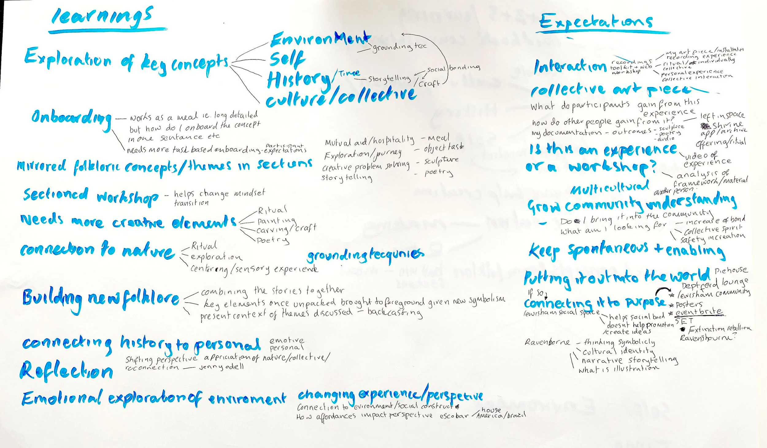 I felt that this workshop was the best in terms of aligning topics, timing, and social interaction. It interwove past and present in a constant analysis of personal, cultural, and ideological perspectives that felt natural, engaging, reflective and questioning with a group of people that were strangers to each other. The group was largely white, but even within that, there was a vast amount of cultural and outlook differences to explore. Going forward, I aim to build on increasing creative output, connection to nature, and exploring how to integrate the future timeline into the process to enhance the longevity of the research, rather than just using it as a reflective tool.