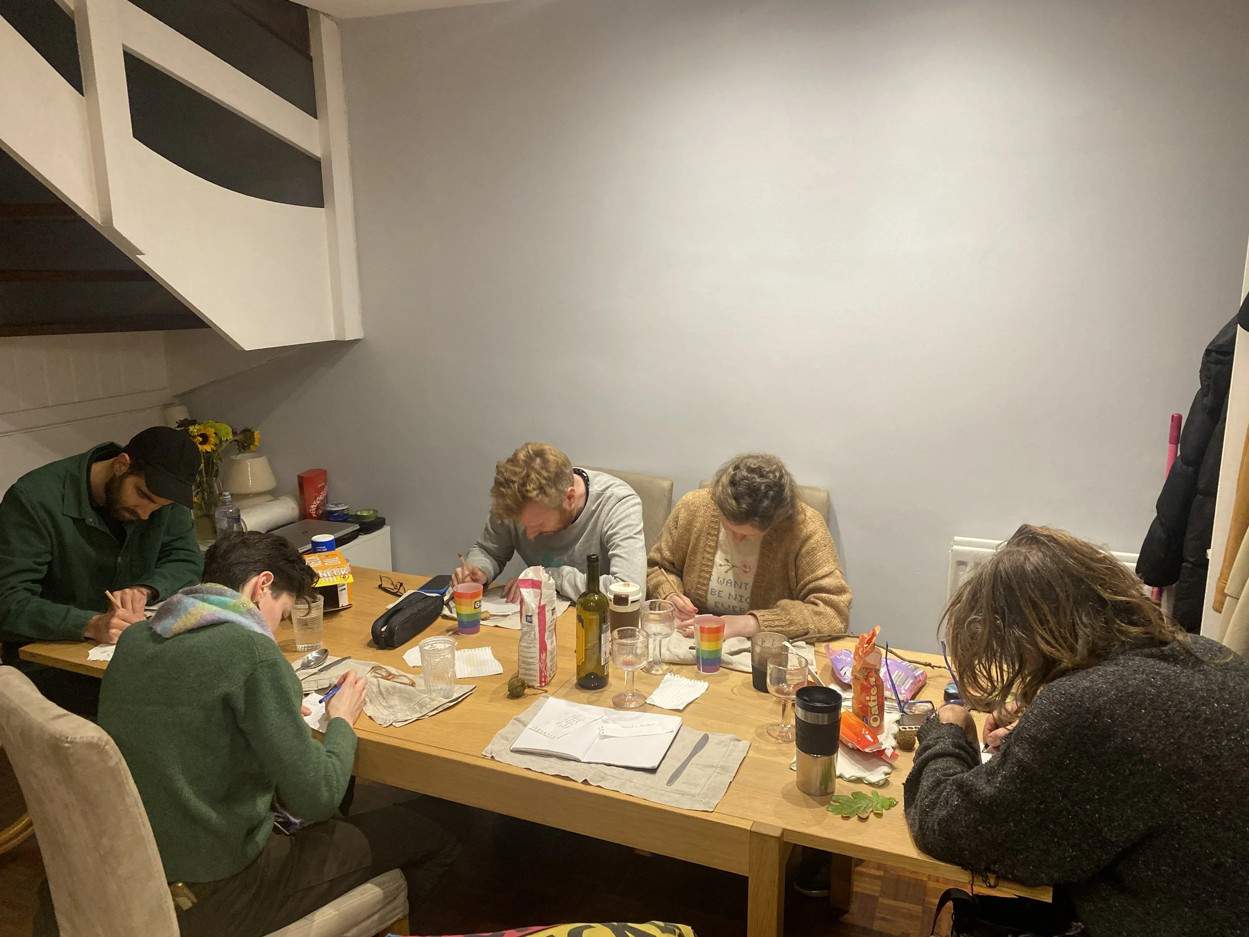 This led me to run a more structured workshop that involved a larger number of participants (see Figure 4). I introduced the idea of a shared meal to onboard the participants, as I knew the project might be difficult to explain, which allowed for collective discussion and negotiation of definition (Lorde, 1979). The meal also aligned with the common theme in folklore of providing hospitality to travellers or mutual aid to the community; survival often depended on sharing community resources. Mutual aid also has a significant history in class struggle movements, as well as in the themes of conviviality explored through fine art performance in the genre of ‘relational aesthetics’ (Bourriaud, 1998). I formalised the storytelling aspect to align more fully with the definition of folklore (Ben-Amos, 1971).