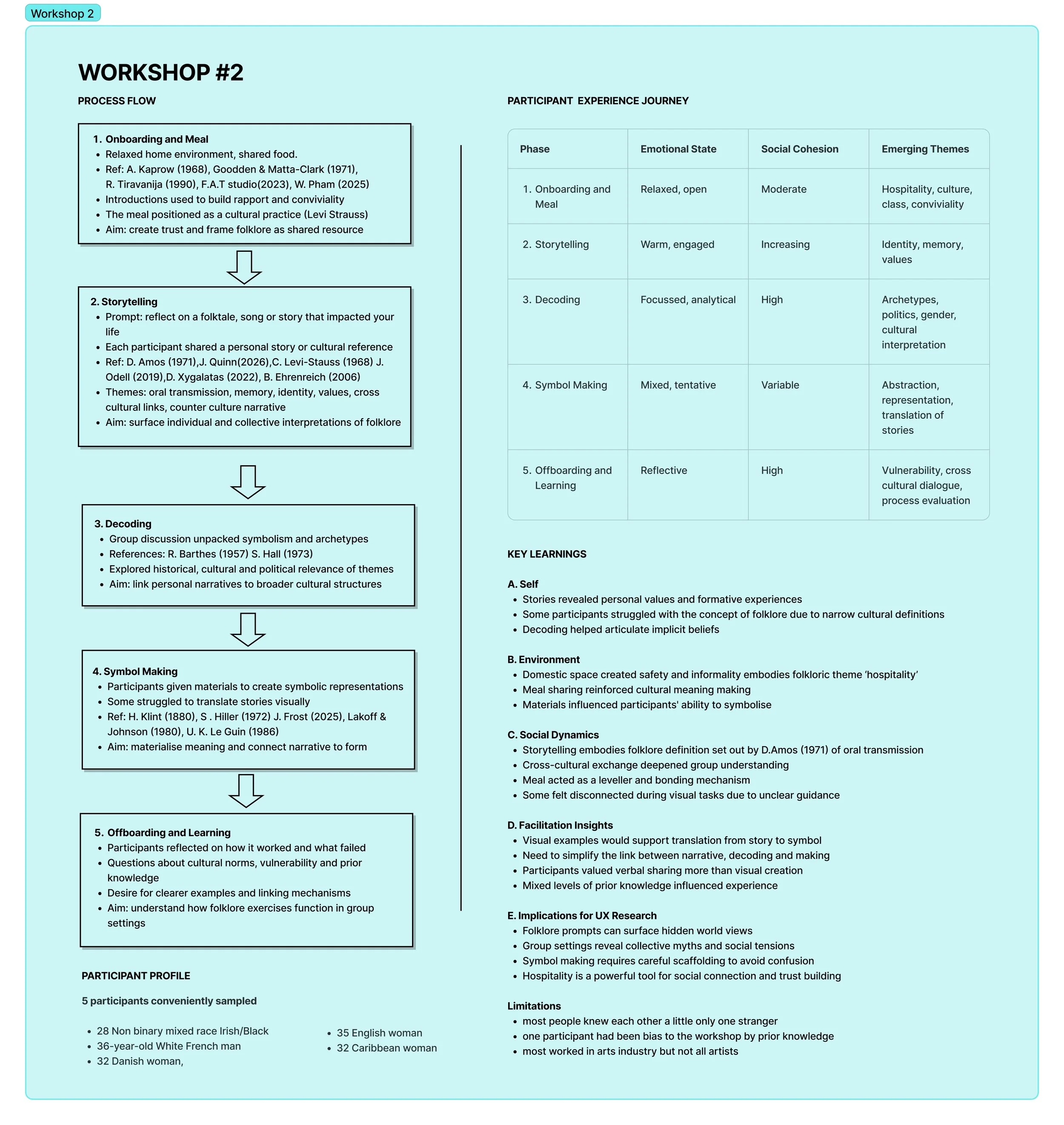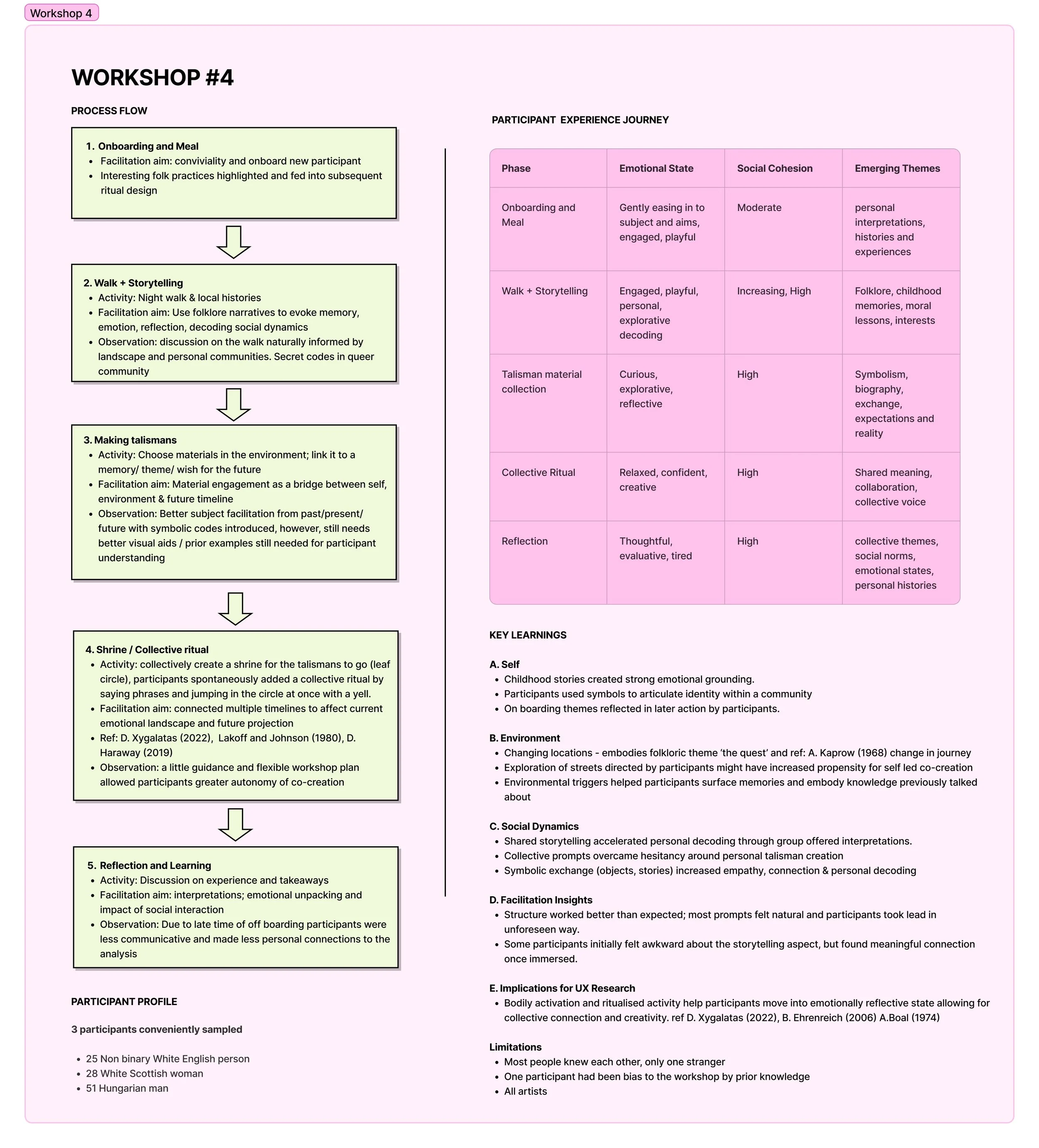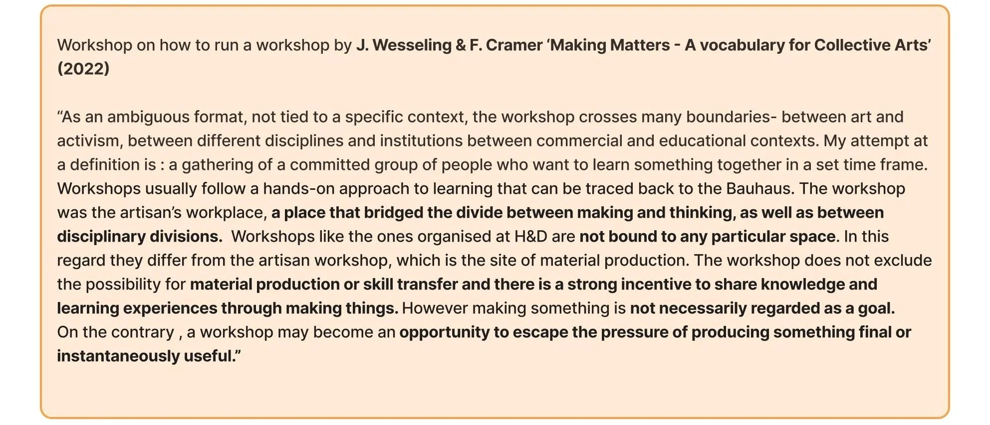 While planning for the next iteration, feedback from the tutors left me somewhat confused. The outcome was a large point of contention, as more traditional UX design tutors wanted a more fixed trajectory in which to assess the success of the workshops. I was reluctant to restrict the process; however, many of the interests I had in the experience were relational and difficult to quantify. Additionally, one of the primary methodologies I had in mind was co-creation, which, in my opinion, contradicts the idea of a specific research question (Deleuze & Guattari, 1980), as participants were to have as much creative power as I did and collectively steer the experience, in reference to Ben-Amos (1971). Alaistair Steele, however, suggested that the outcome may become evident through the making process. I examined how process-led artist research can be observed in participatory arts, dating back to the works of André Breton (1930) and Debord (1958). And later the work of A. Kaprow (1966). J. Wesseling & F. Cramer (2022) write in ‘Making Matters’: “Like art practices, each artistic research project is idiosyncratic by nature, determined by the desire of the researcher to reflect on their practice in collaboration with others.” They also reflect on the definition of a ‘workshop’ in Figure 5, which I found useful in interpreting my workshops/experiences in terms of a “learning experience through making things. However… not necessarily regarded as the goal”.