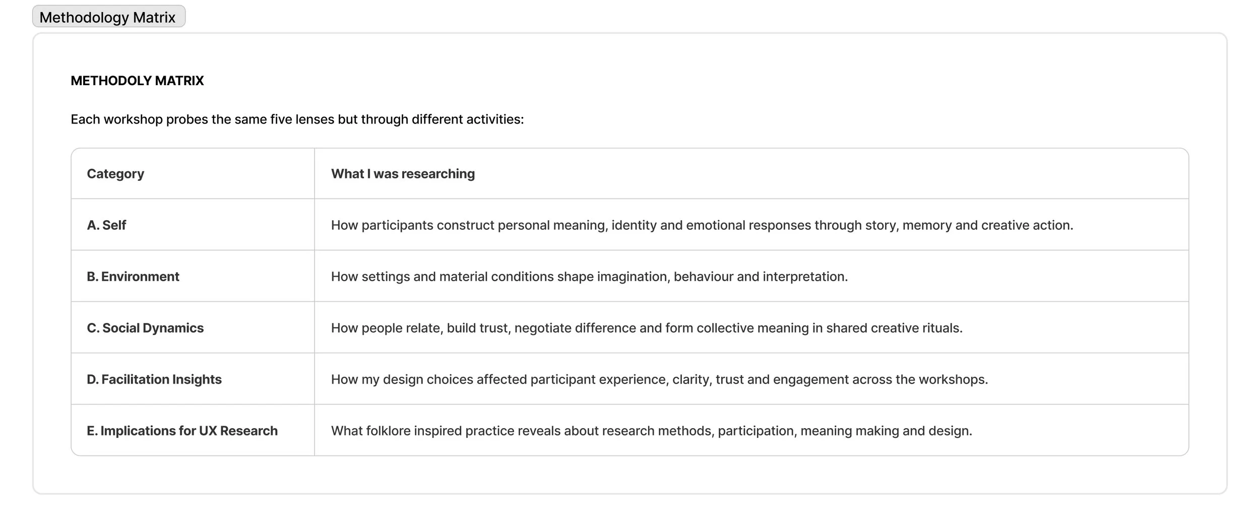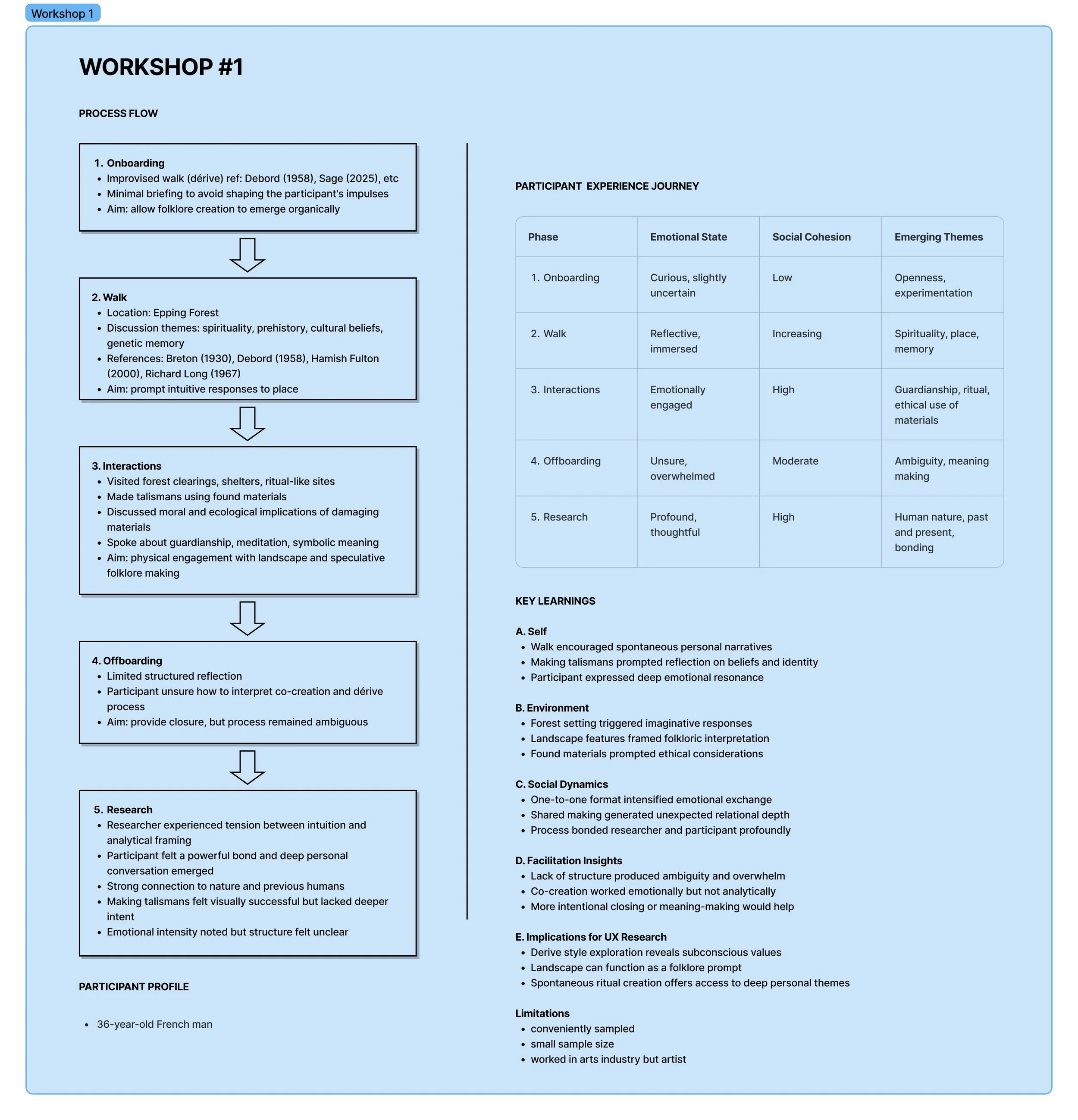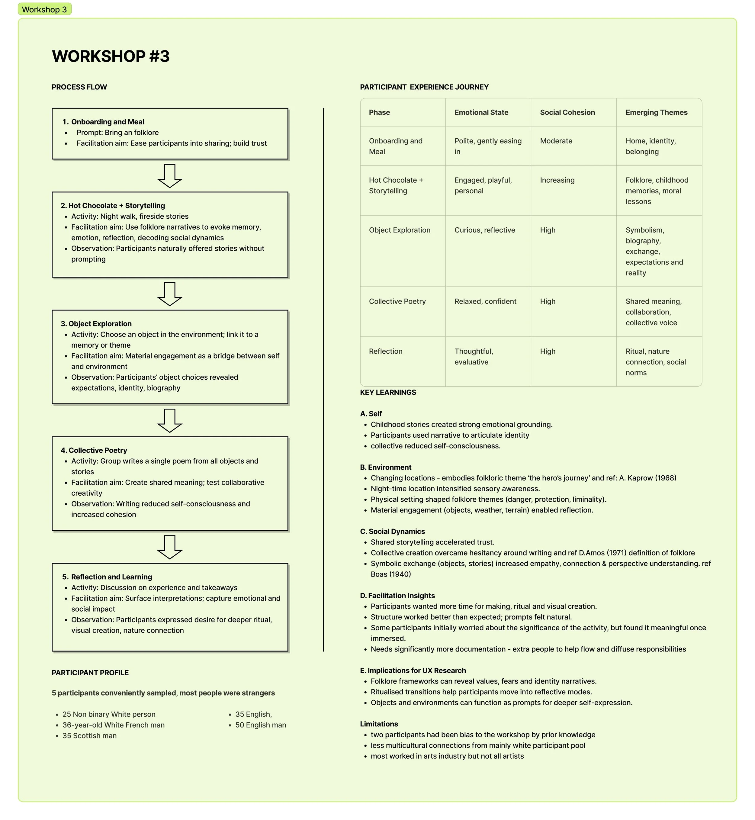While planning for the next iteration, feedback from the tutors left me somewhat confused. The outcome was a large point of contention, as more traditional UX design tutors wanted a more fixed trajectory in which to assess the success of the workshops. I was reluctant to restrict the process; however, many of the interests I had in the experience were relational and difficult to quantify. Additionally, one of the primary methodologies I had in mind was co-creation, which, in my opinion, contradicts the idea of a specific research question (Deleuze & Guattari, 1980), as participants were to have as much creative power as I did and collectively steer the experience, in reference to Ben-Amos (1971). Alaistair Steele, however, suggested that the outcome may become evident through the making process. I examined how process-led artist research can be observed in participatory arts, dating back to the works of André Breton (1930) and Debord (1958). And later the work of A. Kaprow (1966). J. Wesseling & F. Cramer (2022) write in ‘Making Matters’: “Like art practices, each artistic research project is idiosyncratic by nature, determined by the desire of the researcher to reflect on their practice in collaboration with others.” They also reflect on the definition of a ‘workshop’ in Figure 5, which I found useful in interpreting my workshops/experiences in terms of a “learning experience through making things. However… not necessarily regarded as the goal”.