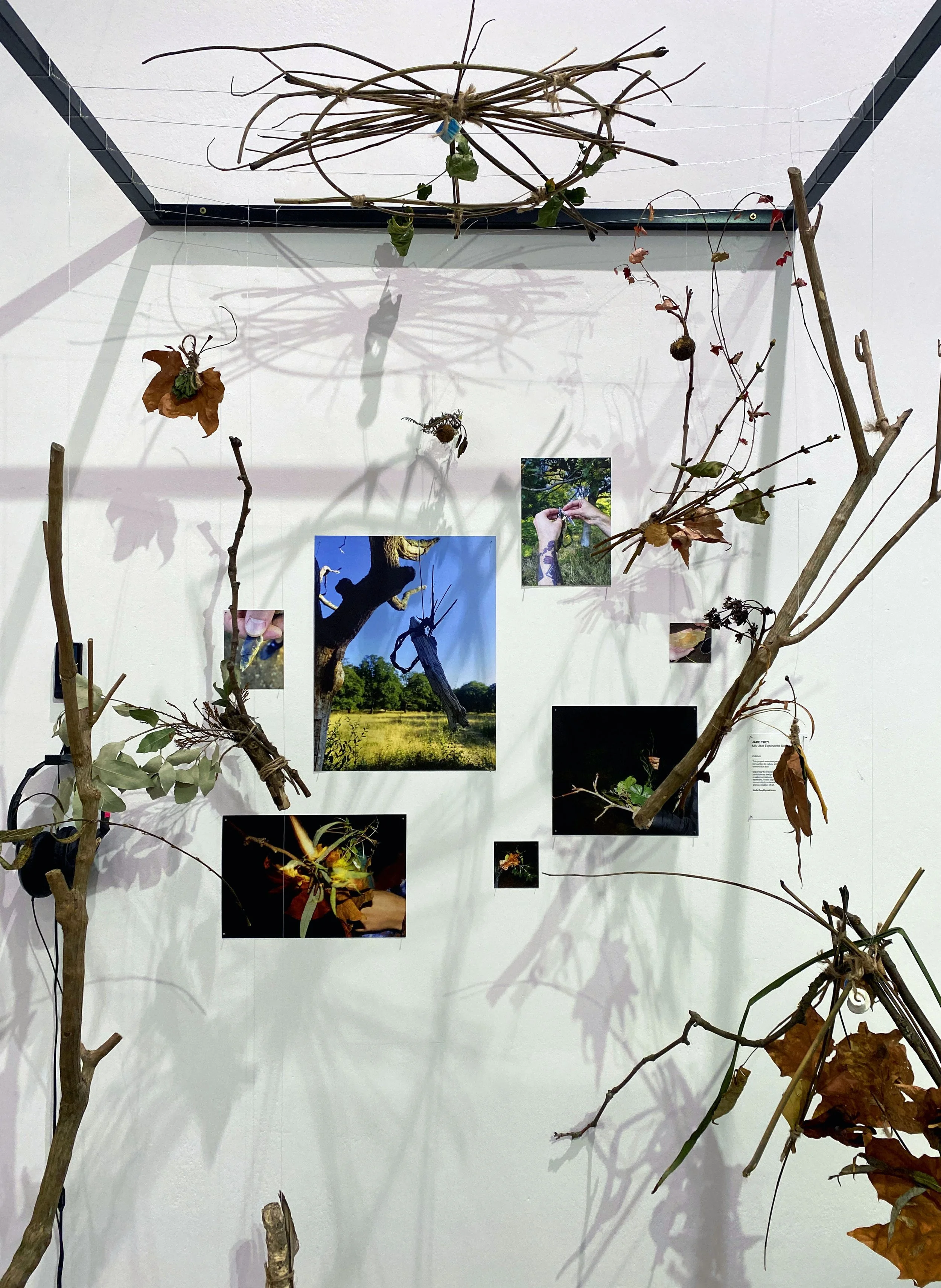 When presenting the installation, I would have preferred a longer time to gather stories and talismans in their current form, as well as a larger space to present, as this limited the visual impact. Creating a spatial sound design would have greatly benefited the installation, as well as employing more researched and experienced preservation methods for the artefacts, since all the plant matter decayed fairly quickly. Originally, I was hoping to create a more nuanced interaction between artefact and story that would allow the viewer to select the story they want to hear.