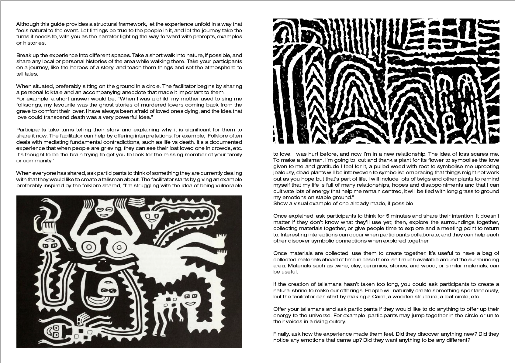 After collating all this varied research, I was rather overwhelmed with the range of approaches I could pursue. As a result, I co-created a dérive, as described by Debord (1958), as an experiment. The experience started rather meandering and disconnected, as it was intentionally unplanned. A personal connection to time emerged through witnessing previous human intervention and theorising around purpose. The connection to the community, as well as the participant, was accentuated by commonalities in their ways of thinking. Creating the talismans felt a little forced, as the found materials were not ideal, and they did not embody any ideological significance. The outcome for the participant was difficult to measure, as offboarding needed improvement; however, he did say that the experience created a strong bond.