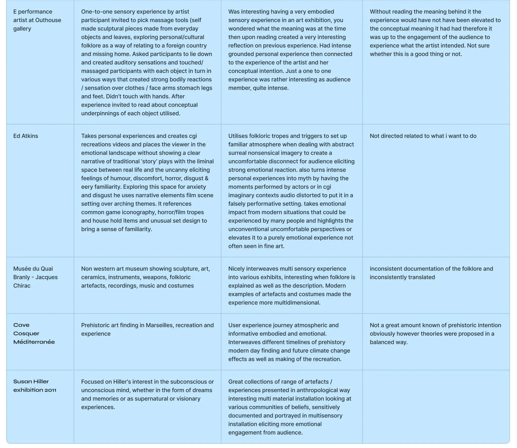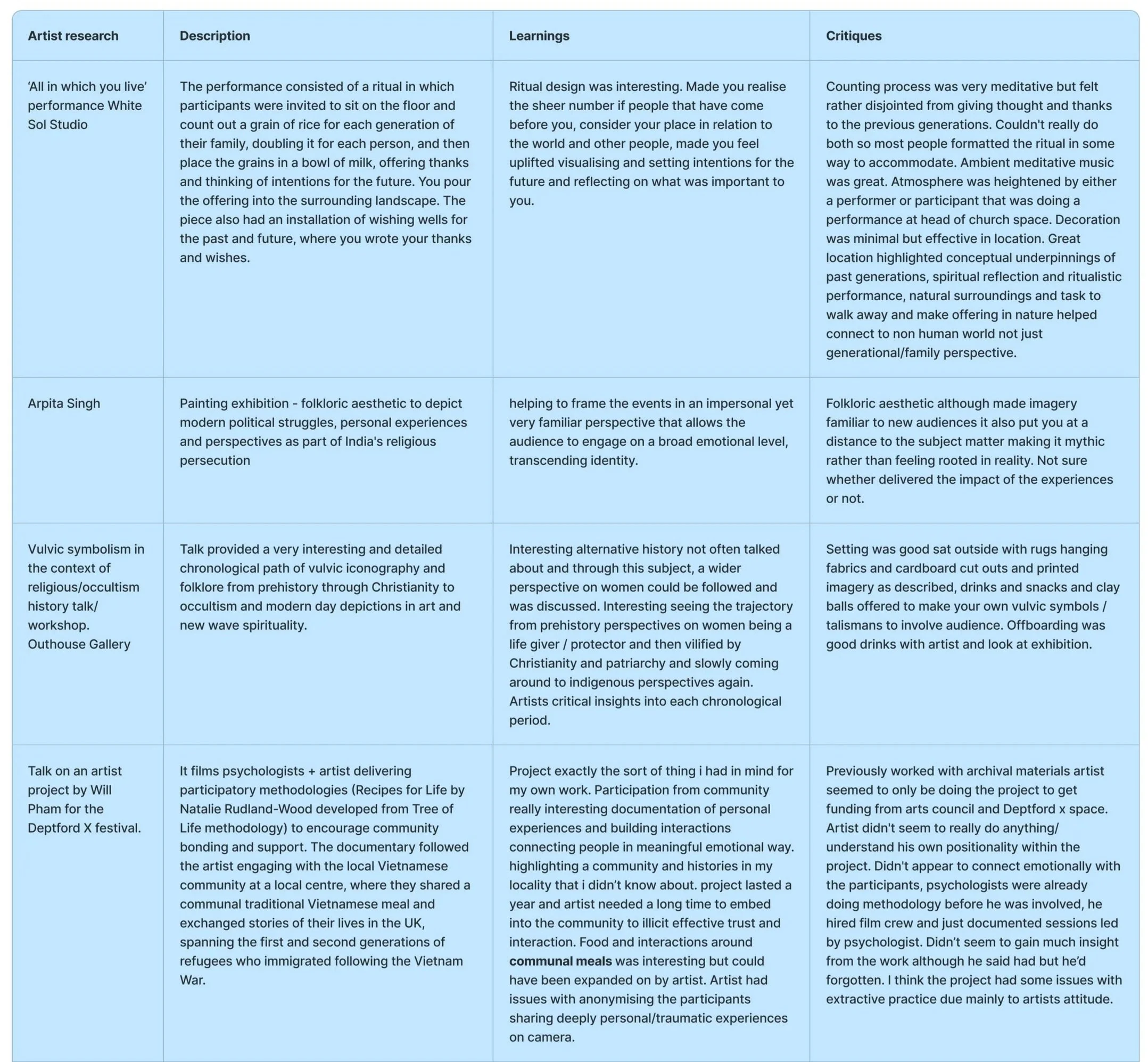 If I were to continue with the project, I would consider incorporating more ritualistic elements into the meal to better link to the subsequent stages. I would try serving outside if possible. Make the seating arrangements, food or way of eating have more symbolic meaning. Referencing Sophie Calle (1998), Méret Oppenheim (1959), And R. Tiravanija (1990). I would perhaps take the experience to places such as the Outhouse Gallery or Deptford Lounge to try it in a more formal setting with a broader participant pool, to see if the same connections can be made in a non-conveniently sampled pool.