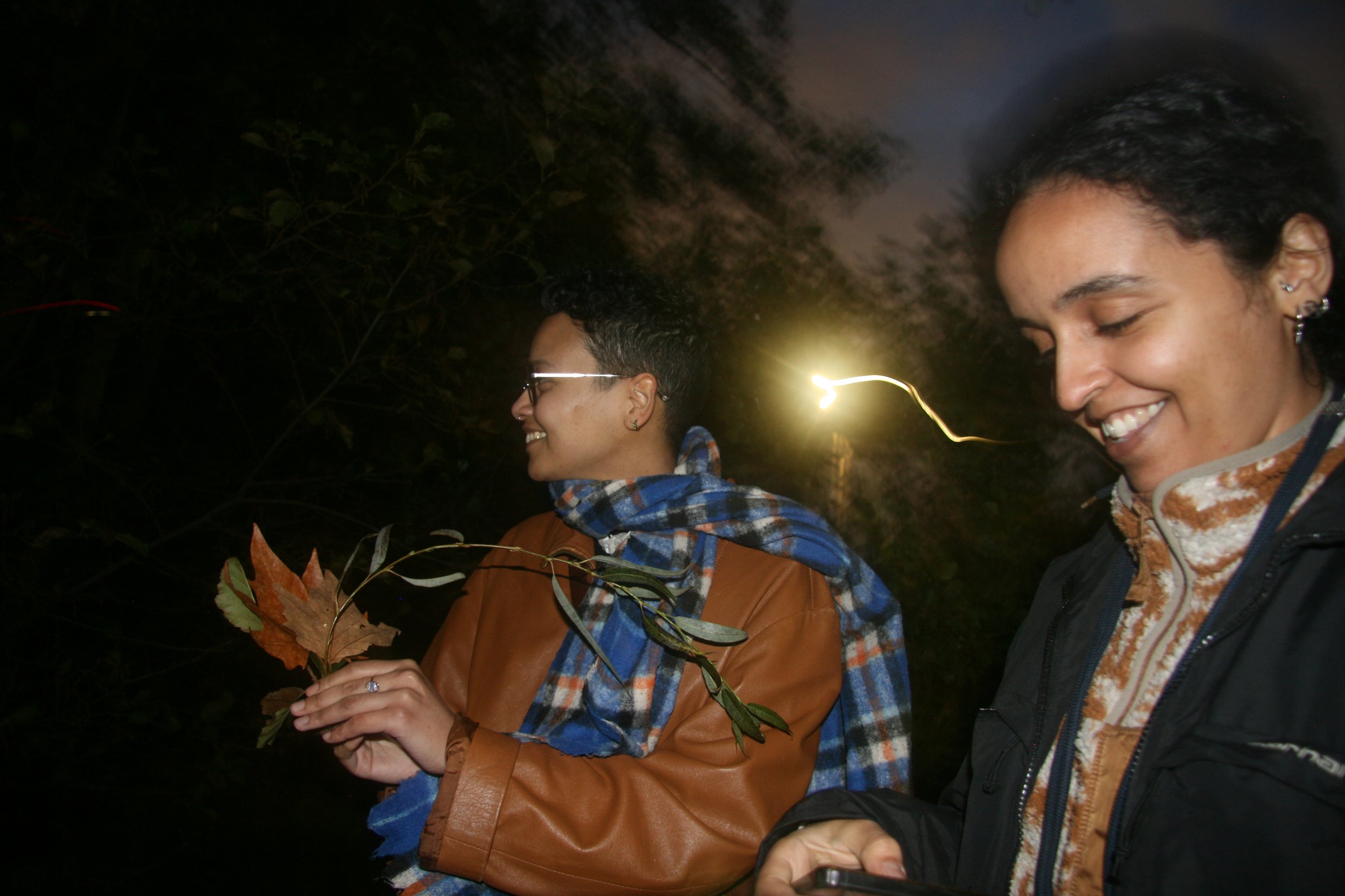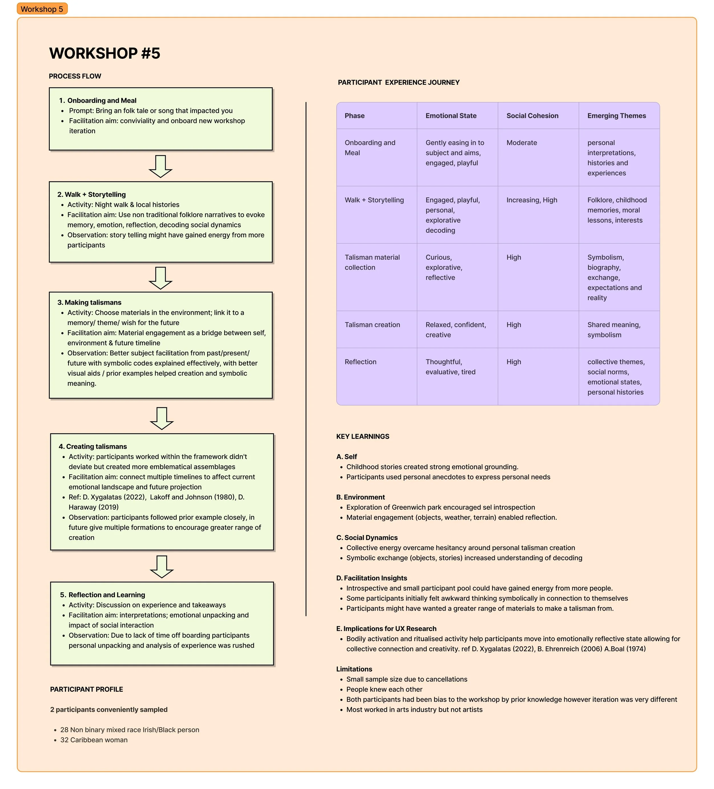 I ran the workshop again in the hopes of attracting more participants to see if the experience was repeatable, but due to participant cancellations, I ended up with only two. They had both attended the second workshop, so they had a good understanding of the subject. However, the process had undergone significant changes by this point, and I hoped it wouldn’t bias them too much in the process. I employed a friend to help me document and facilitate, and although it helped to gain documentation, I feel that it significantly hindered the workshop. Participants were unsettled by the photography and disrupted the flow of conversation at many points. The workshop didn’t have as much life as the previous one, perhaps due to the documentation or perhaps because the participants didn’t have as much personal experience/interest in folklore, or maybe it was due to the group size. Whilst onboarding, I used the talisman I had made in the previous workshop, as well as the others, to help explain the talisman-making process, which worked well. Visiting a new location helped evoke memories of campfires, and participants soon began sharing emotionally charged stories that created a positive, bonded atmosphere. When gathering materials, participants were playful, inquisitive, self-led, and helped each other create symbolic codes. We spent a lot more time assembling the talismans together back at home, to the point where we ran out of time, and they had to leave with minimal offboarding procedures in place. The talismans created were very similar to my own and didn’t have many creative differences. In the future, I would present multiple versions that offer various creative options as well as materials for participants to work with.