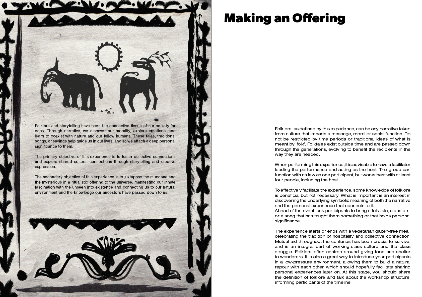 I began my practical research by conducting directed storytelling interviews with four participants. Directed storytelling is a research method that enables the researcher to gather rich, lived experiences by framing questions so that participants can engage with emotionally charged material within a narrative structure that distances the interviewee, much like folktales themselves. The prompts asked when they first experienced folklore, what they learnt from it, and if they had any knowledge of other cultures’ folklore, so that I could test whether the premise of my project was supported by their experiences. The participants were conveniently sampled from my close circle, which may imply a certain degree of similarity in worldview.