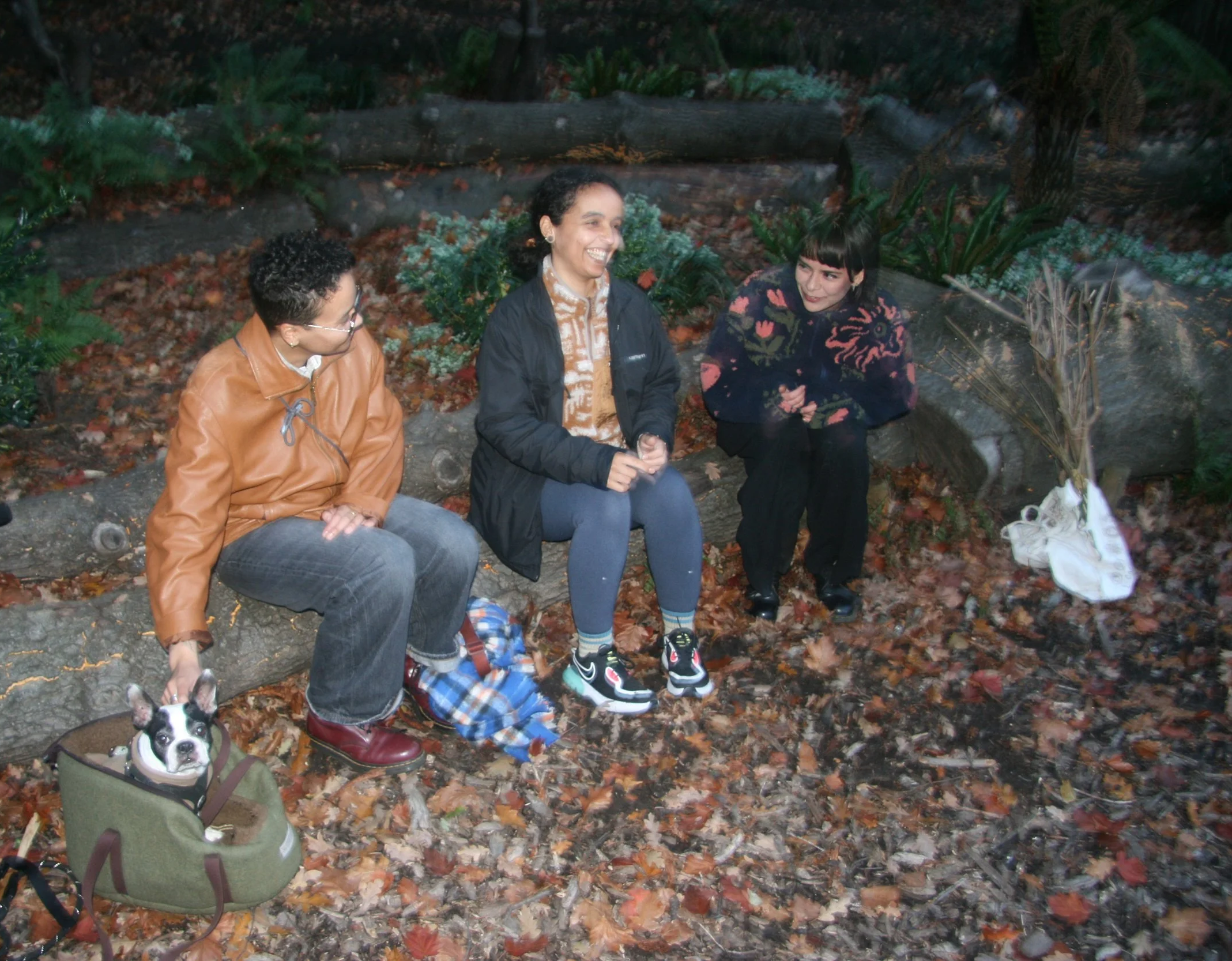Decoding was iterative, with participants adding reflection as they analysed their own interpretations and in response to others. I attempted to do a grounding exercise at this stage, originally designed to increase connection to nature. I had intended to start the workshop with it; however, because the participants had already started telling stories while walking, I didn’t want to disrupt the flow. However, trying to incorporate it afterwards felt forced and halted the energy. The explanation of the talisman task, although fairly effective, could have been done with visual representations of previous examples. Participants deviated from my suggested path and only gathered one item each, although they still functioned in the intended purpose. I suggested collectively making a shrine for the talismans to go, and the participants, in response, also chose to create a ritual around the placement by jumping in at the same time. I was pleased that participants had taken the initiative on their own and that it reflected the conversations we had during onboarding about rituals earlier. As it was quite late at this point, the offboarding wasn’t as reflective or energetic, but participants provided some valuable insights into the emotional processing of the experience and how the collective themes that had emerged had influenced them.