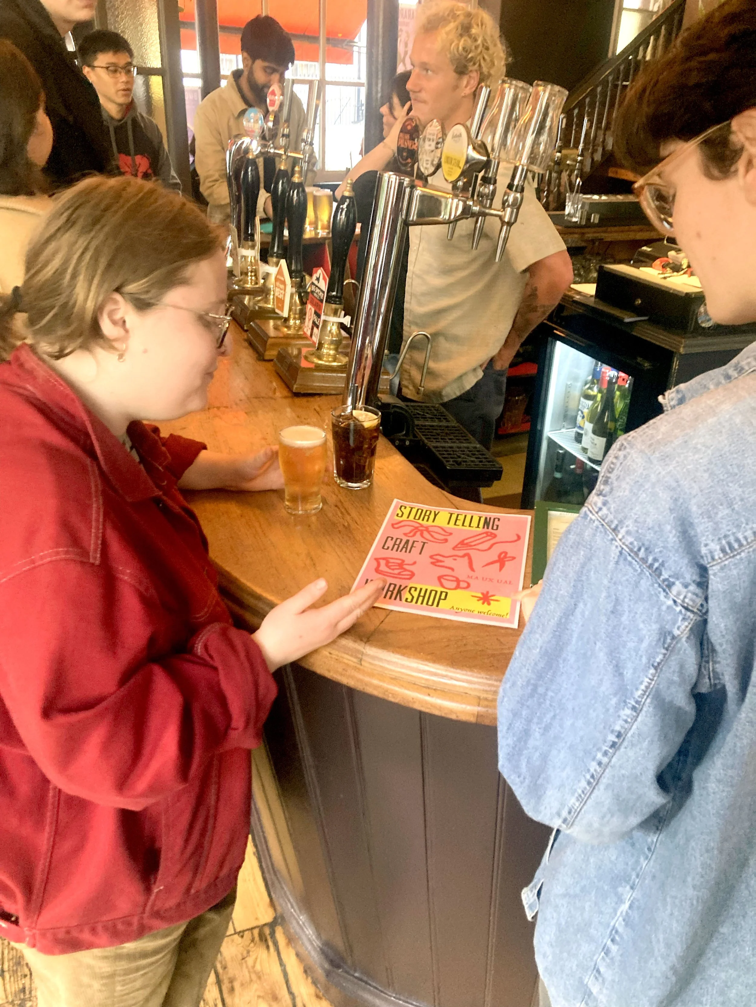 We ran out of time advertising the workshop, as I only managed to get The Roebuck to agree to let us run it a few hours ahead of time. However, I made some flyers to put up around us so that we weren’t just going up to people cold. We put them around the bar, and anyone who read the posters was invited to join. Unfortunately, there was already a pub quiz going on, and the other people were reluctant to leave their conversations.