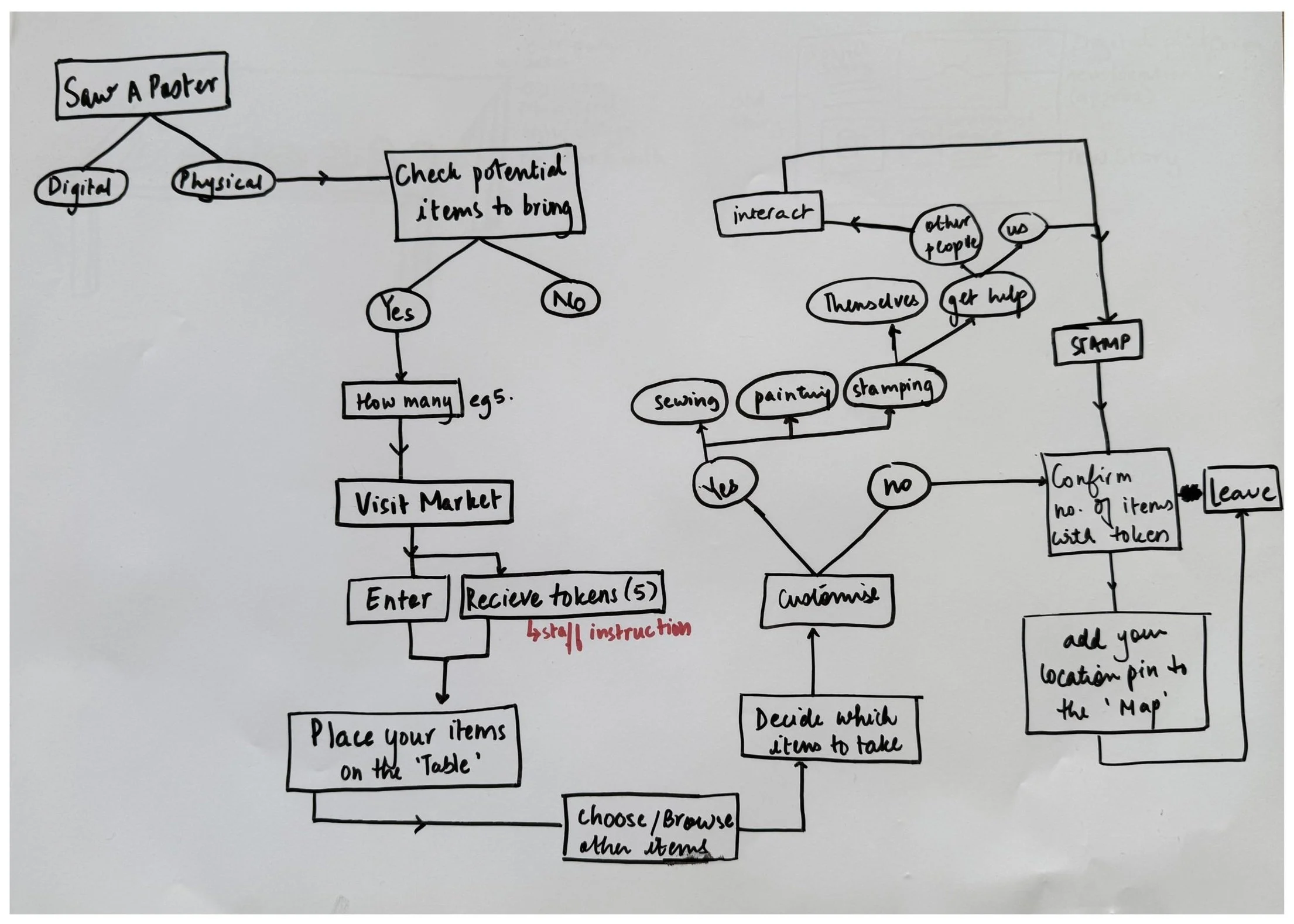 This idea changed to writing a story tag of where the item came from and attaching it to the item. People could then swap in their own items and write their own stories. This would remove the monetary value, which seemed problematic. However, after bodystorming a few times, a research method that allowed us to act out the interaction with each other, we found the written aspect didn’t work and was taking the interaction out of the experience rather than amplifying it. We needed to quantify how much a story was worth. After feedback, we then tried running a stall ourselves, testing multiple ideas; however, the carboot was very soon after the presentation, so I don’t feel we really explored the ideas in a satisfactory way that would get any good results.