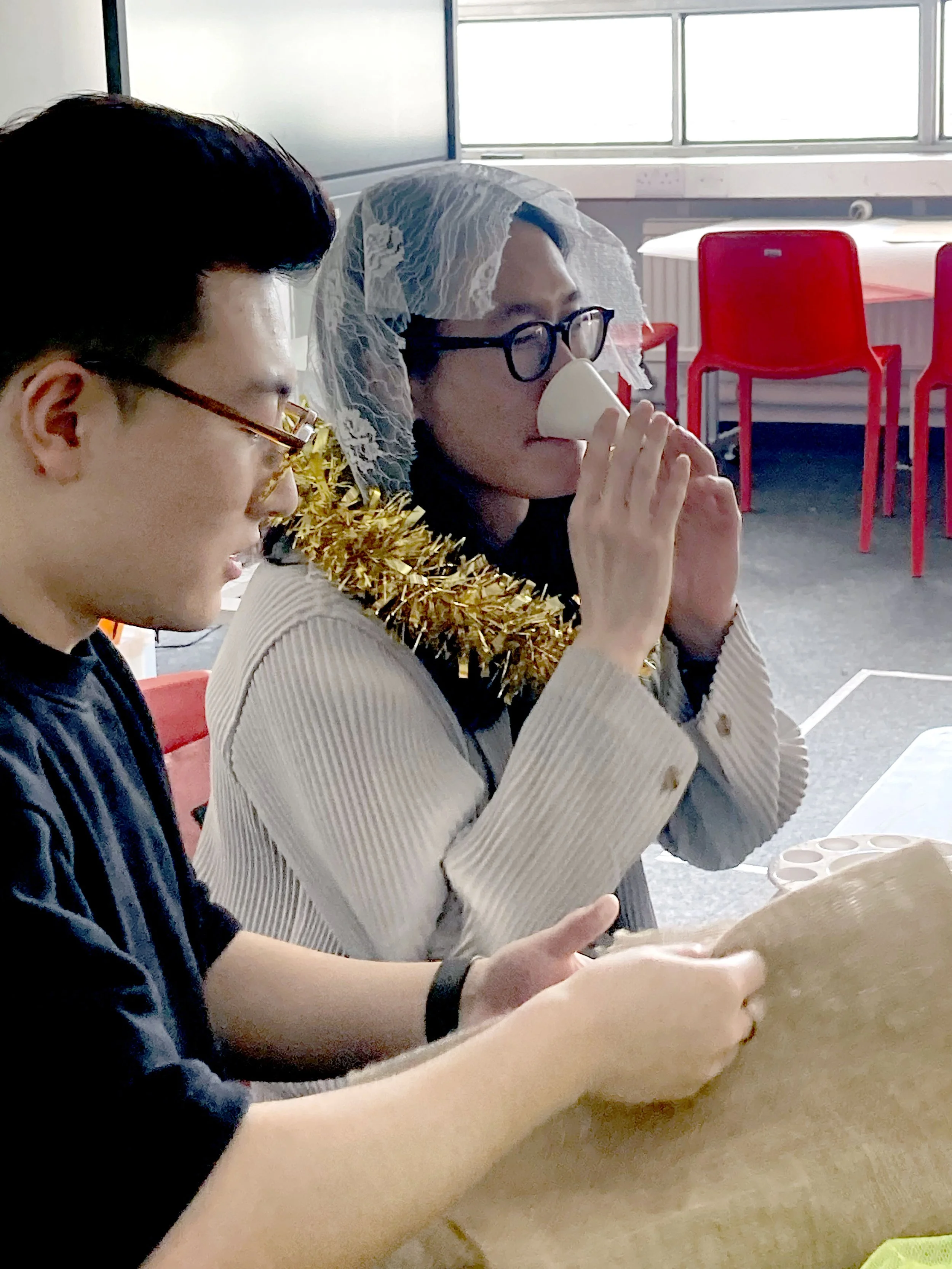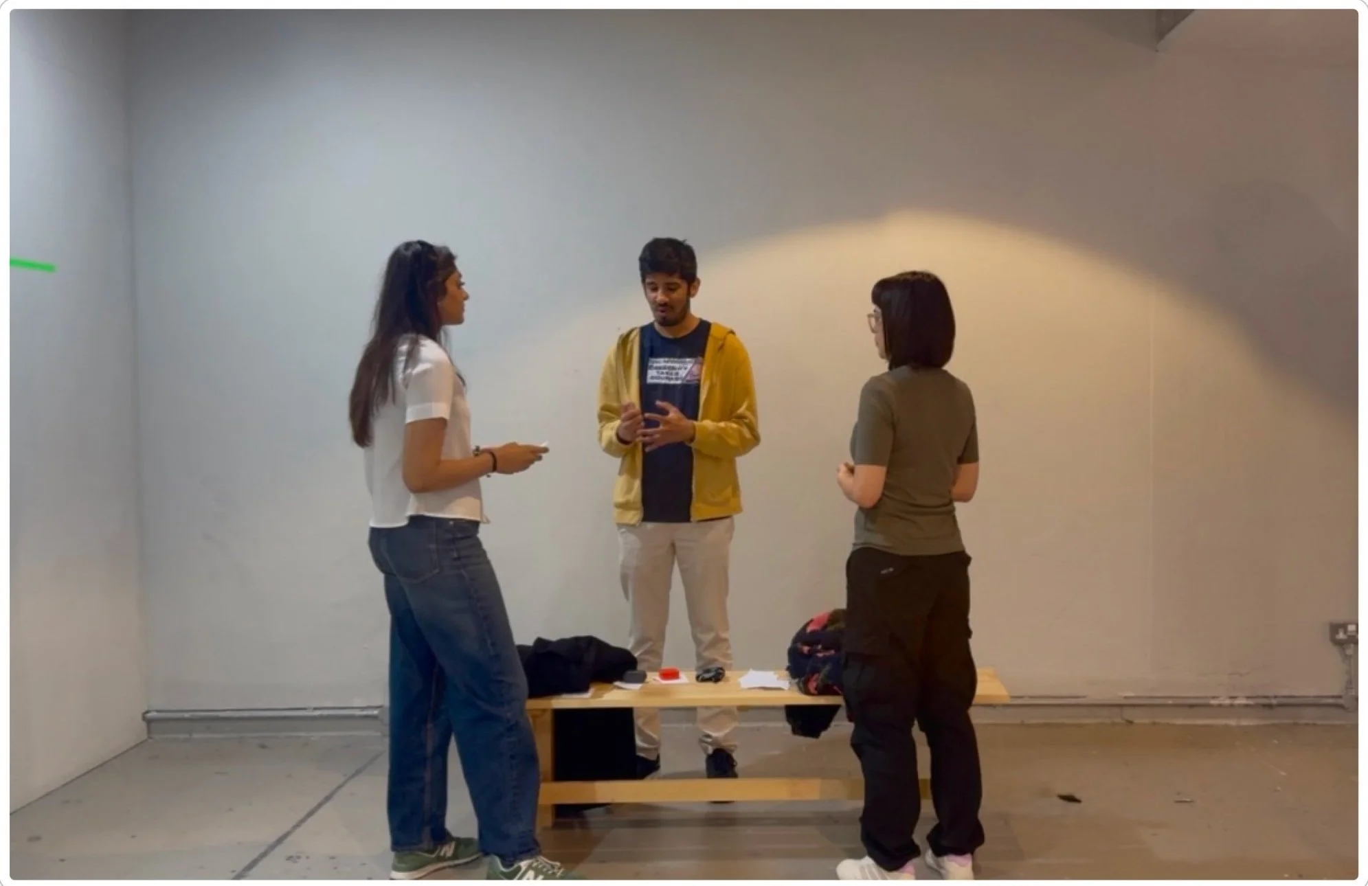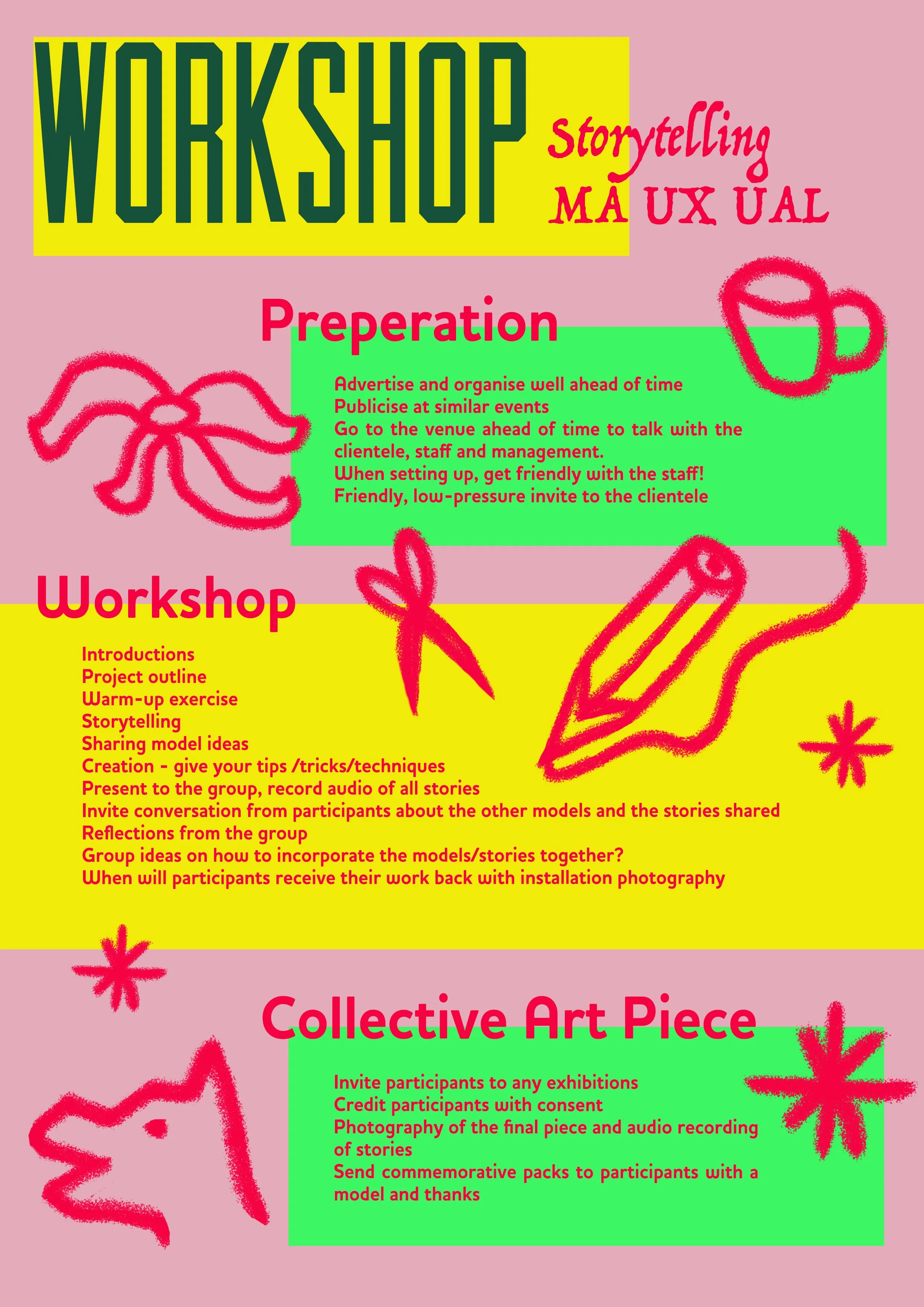 We ran a test with Alex to test the flow of the workshop and realised that having clay only would force people to work on a small scale, so we decided to expand our materials. Feedback was that the offboarding could be more in-depth. We also changed the running order of our process from (making model to telling story) to (telling story to making model) to encourage the participants to create something less representational and more imaginatively interwoven with the story being told. We repeated the test with more participants; three LCC students were conveniently sampled, as with Alex, which meant that these people were fairly creative and used to thinking/making artistic objects which other people might not. However, we found that the changes we made were successful and participants made more imaginative outcomes, told interesting and personal stories and had more performative interactions with the materials.