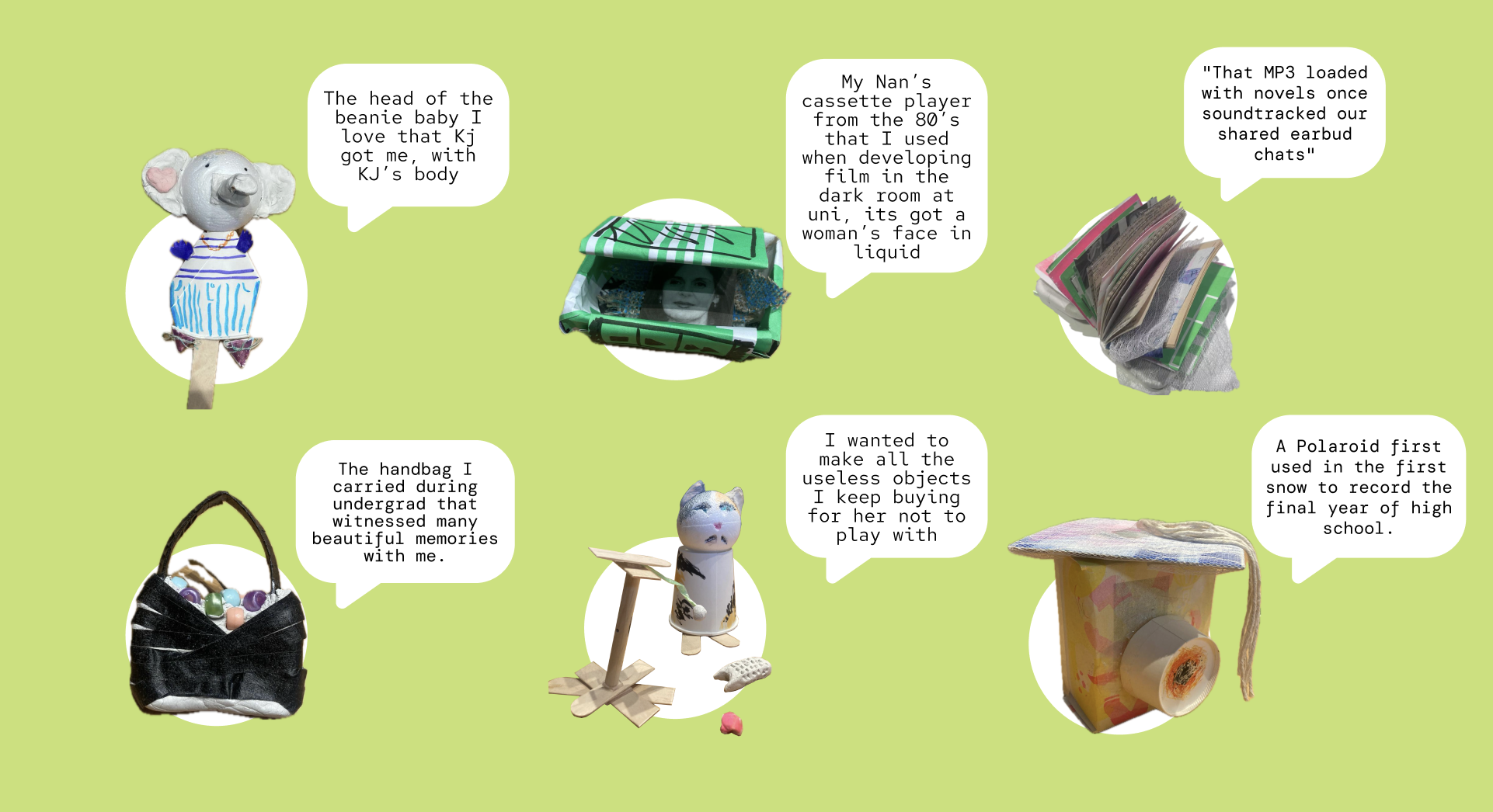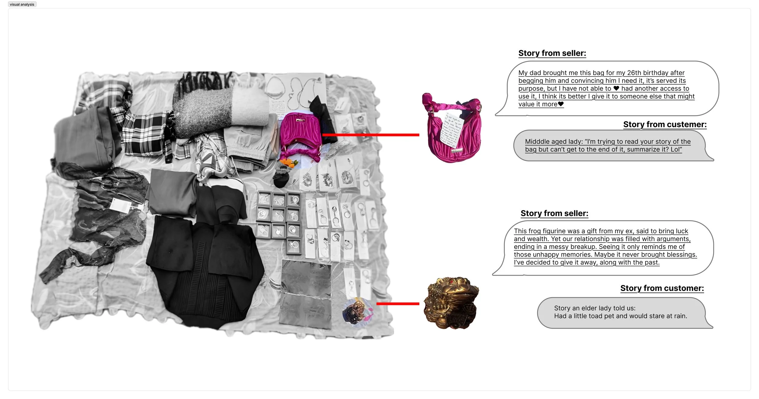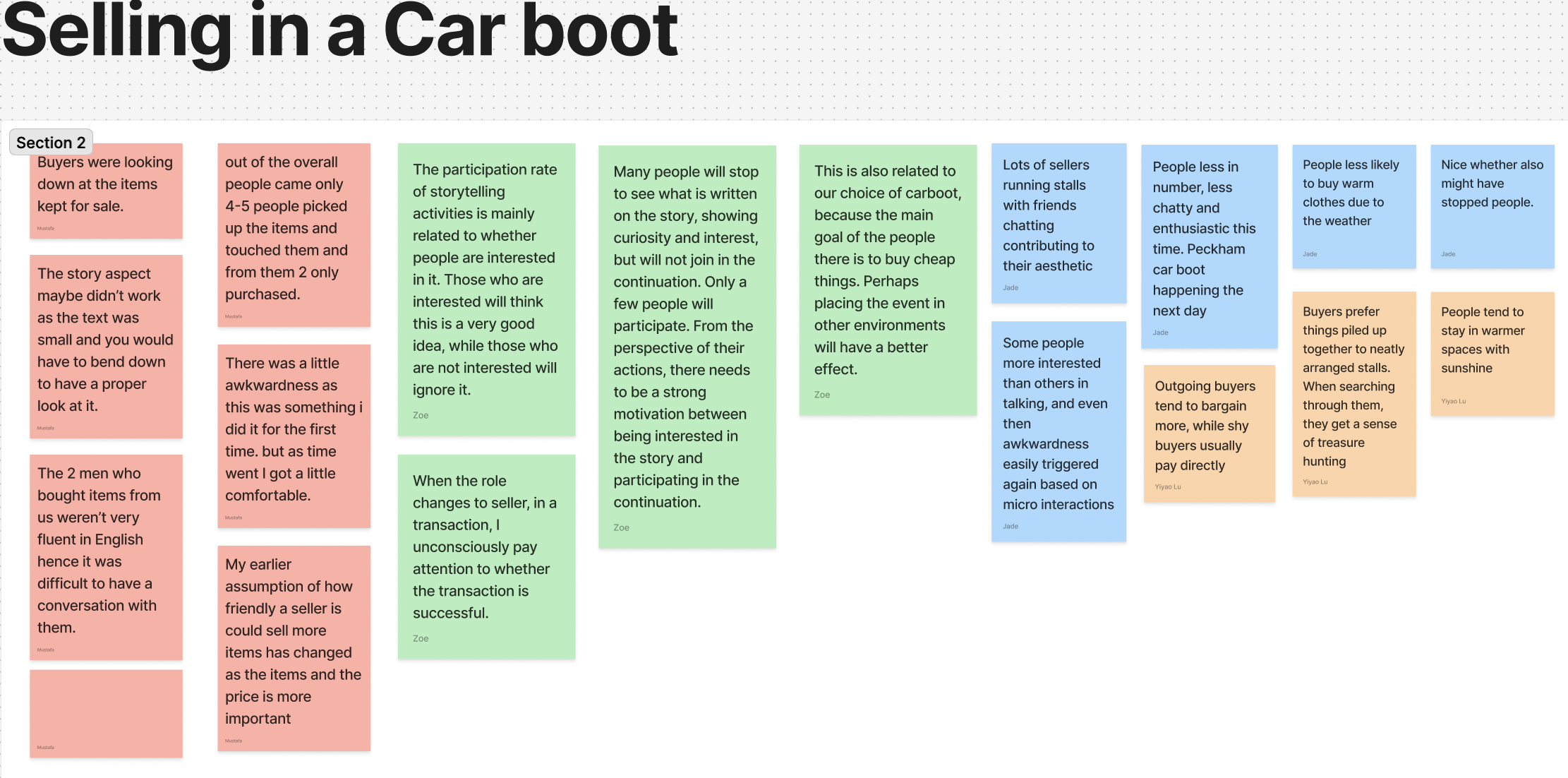 After this, we used affinity mapping to research new lines of enquiry, as most of the group didn’t want to pursue the storytelling aspect; however, I didn’t feel as if there were many other avenues. The team decided to make a Live Action Role Play to explore multiple ideas; however, upon first trial, the findings were transactional, and no value exchange occurred. This led to the reflection that we were overcomplicating it, and we needed to bring it back to the micro interaction observed at the carboot and decided to look at the intergenerational storytelling interaction people had through objects.