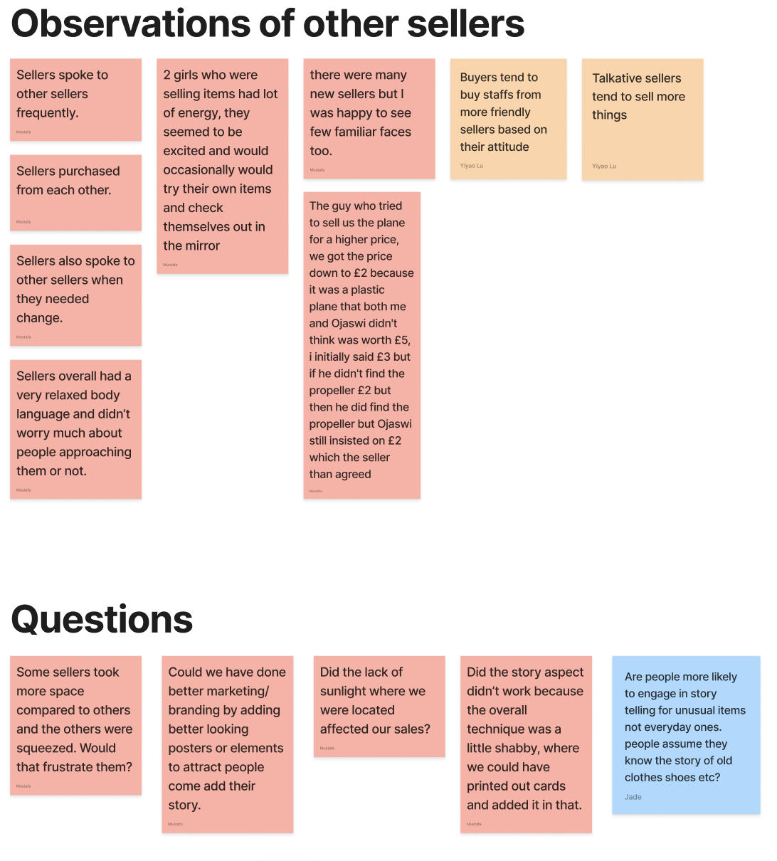 One thing to note is that when asking people questions, we got quite a suspicious, antagonistic response from sellers, presumably wondering if we were trying to either find out the real value of the items, buy our own stock and undercut them, or investigate fake/stolen items. I automatically emulated the interactions already happening in the market around us as a way of getting the most natural/authentic interactions possible. This possibly poses a slightly grey area in terms of the ethical side of our research. However, we came to this research from an observational standpoint that led naturally from AEIOU into a more in-depth exploration of why these observations might be happening.